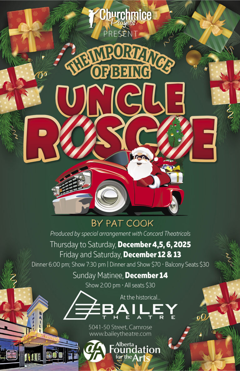 It's almost Christmas–the season to be jolly–but things are stressful for the Kendall family! Job woes, money woes–and Uncle Roscoe is due to arrive any day for a visit. Add a case of mistaken identity and a couple of “lovable" con men, and things get really complicated. This retro holiday celebration is filled with warmth, humour, and a deep appreciation for the joys of life–making it delightful for any season! Perfect for your family, friends and business party! Enjoy a delectable seasonal meal - turkey, ham and all the fixings.